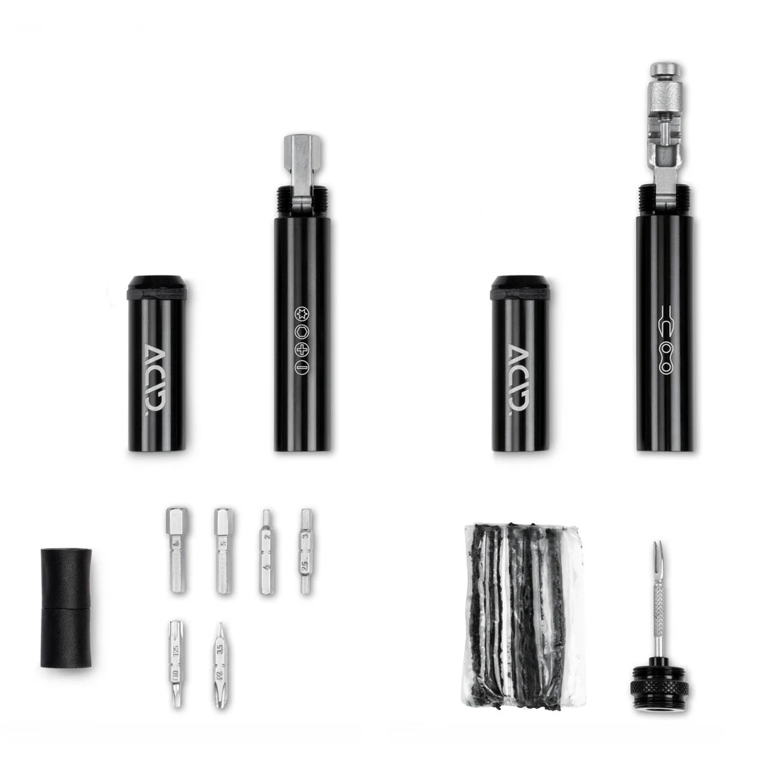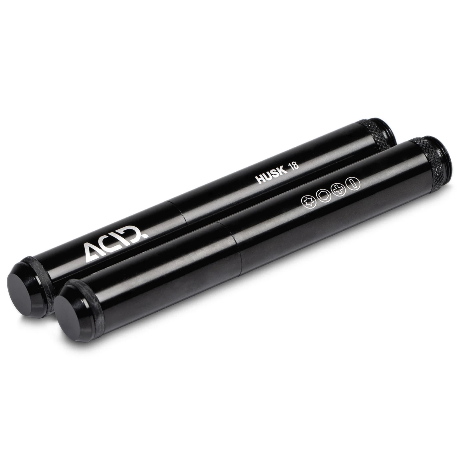 The Cube Acid Husk 18 multitool consists of two high-quality metal tubes. Inside these tubes all 18 tools find space and are well protected from dirt as well as moisture. Some special features are a chain riveter and BIT holders, that are foldable by 90 ° for better leverage. In addition to a selection of bits with hexagon socket, Torx and screwdrivers, the set offers various tools for chain, tire and tube assembly.