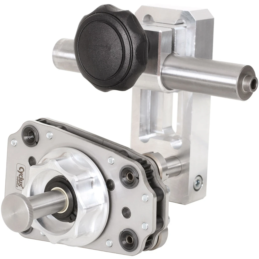 The dual disc mount facing tool can be used universally by simply changing the facer and clamping position. It mills 100% even, at a 90° angle. The exact 90 ° angle and the parallelism of the disc brake mounts are ensured by the fact that the facer is clamped only once and both disc brake mounts are milled simultaneously.