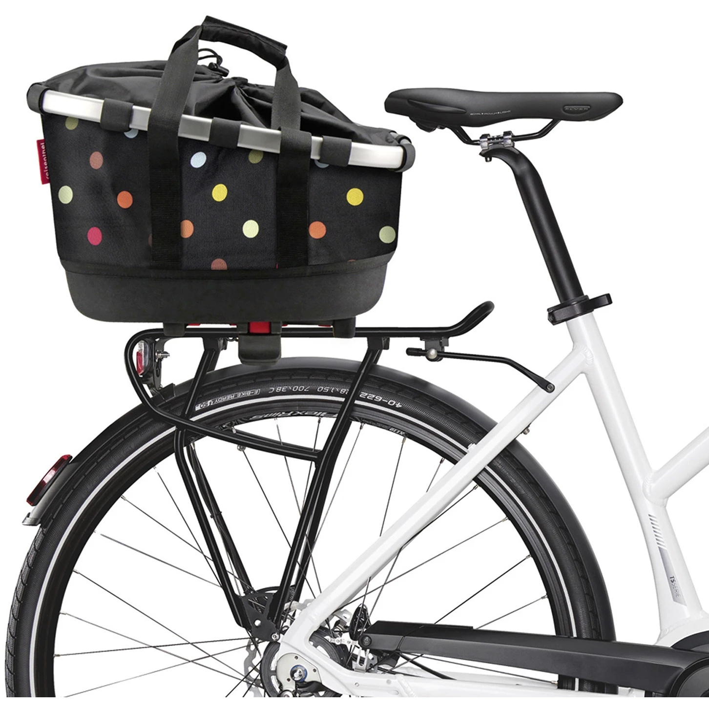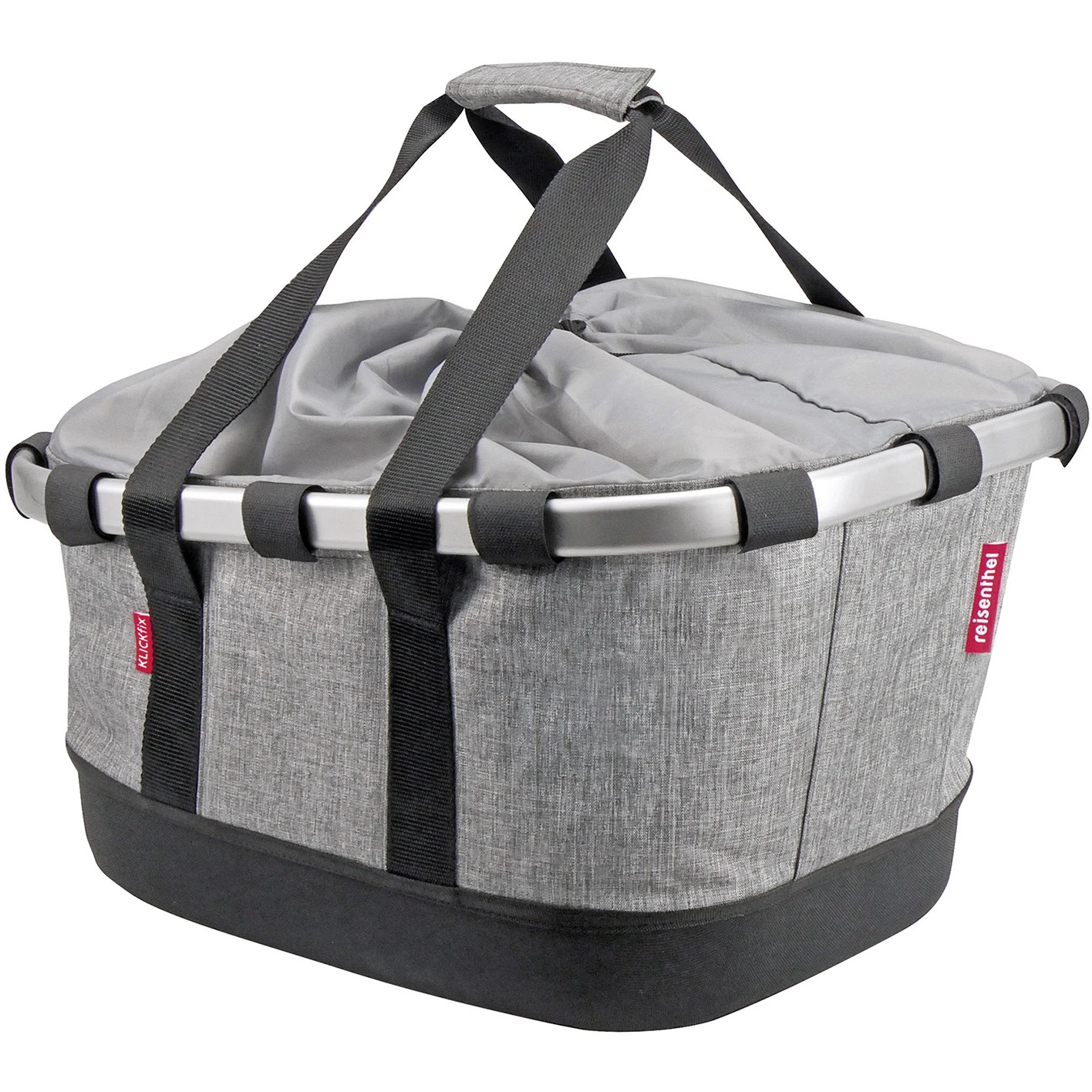 Lightweight, longitudinally oriented Reisenthel fabric basket for luggage carriers with sturdy thermoformed bottom and flexible carrying straps. The classic, forward sloping basket shape creates space for the saddle and freedom of movement for the cyclist. A drawstring protects the contents from jumping out, a zippered compartment inside offers space for keys and valuables. The stiffeners can be removed so that the basket can be stored flat to save space.