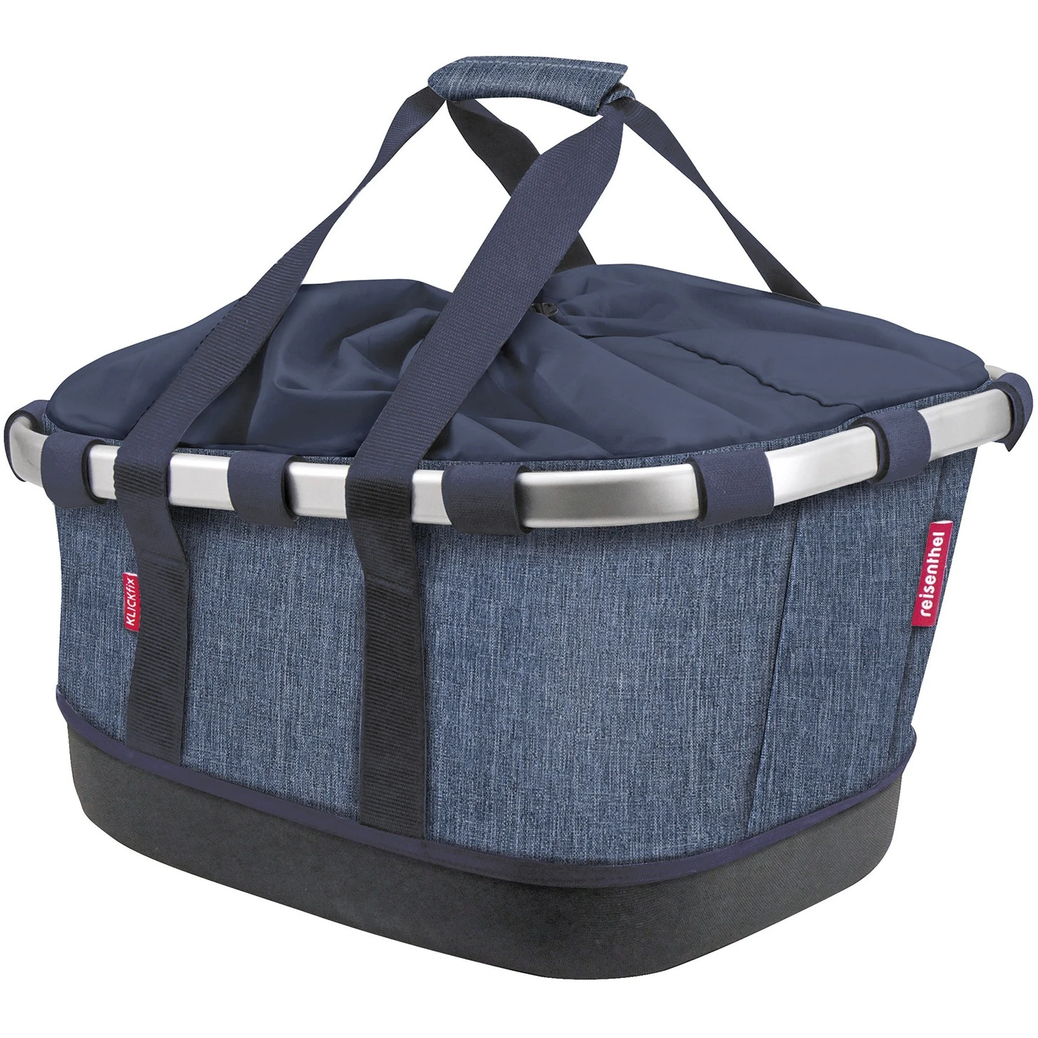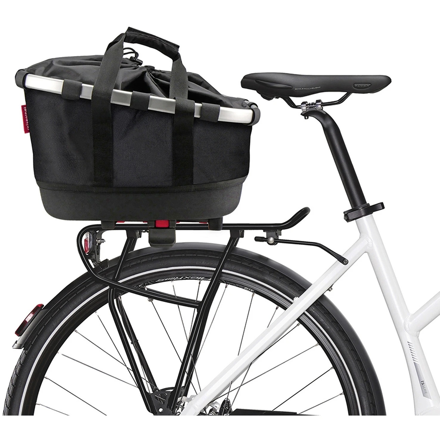 Lightweight, longitudinally oriented Reisenthel fabric basket for luggage carriers with sturdy thermoformed bottom and flexible carrying straps. The classic, forward sloping basket shape creates space for the saddle and freedom of movement for the cyclist. A drawstring protects the contents from jumping out, a zippered compartment inside offers space for keys and valuables. The stiffeners can be removed so that the basket can be stored flat to save space.