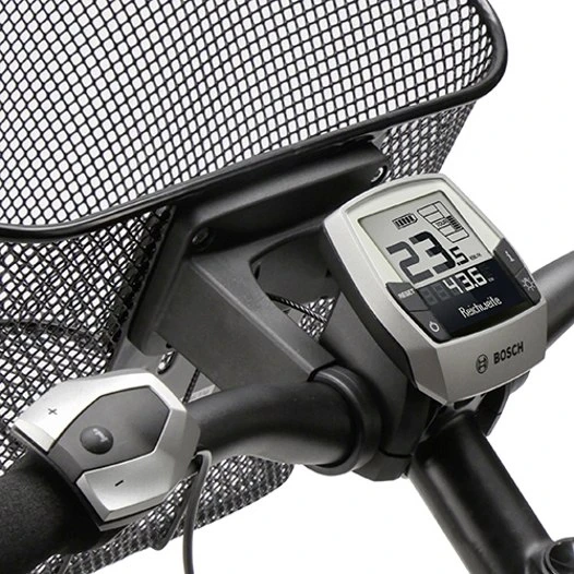 Basket for permanent installation on e-bikes with centrally mounted displays. Thanks to its increased interspace of 78 mm, the holder encloses the display. The basket can be adjusted between three different heights. Thanks to the patented anchoring cable, the adapter holds accessories in a fixed, stable position even with heavy loads up to 7kg. Fast and easy mounting. No additional supporting connection to fork or headset is required. Fits all standard handlebars from Ø 22-26mm.