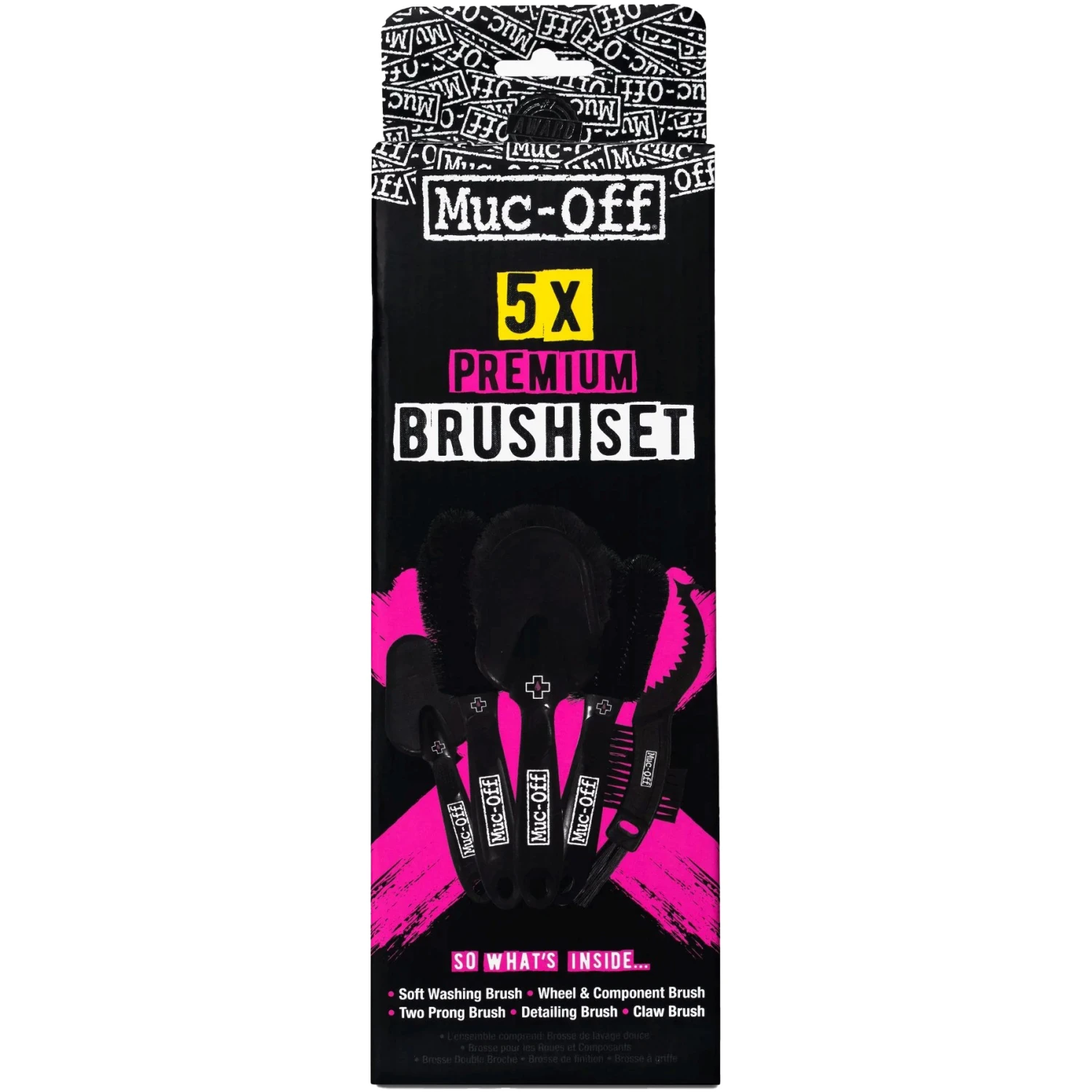 A clean bike looks good, rides better, lasts longer and is easier to maintain. Brush set for complete and thorough cleaning of all bike parts. The set includes all 5 Muc-Off brushes to perfectly clean every part on the bike. The soft wash brush is ideal for cleaning frames and components, the smaller detailing brush for hard-to-reach places like hubs or fork crowns and the Claw brush for chain, cassette or chainrings. The wheel and component brush is shaped to remove dirt from rims and spokes with ease, while the Two Prong brush with its two bendable brushes is very suitable for parts such as pedals, crank or shock. So really every part on the bike can be perfectly cleaned. The brushes have durable nylon bristles and a rubberized surface for optimum grip and to protect paint and sensitive parts.
