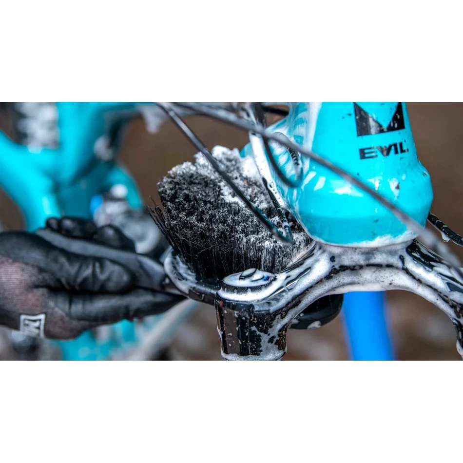 The Soft Washing Brush sintered bristle compound is designed to clean the bike frame and components while caring for delicate finishes. All new design featuring a tough impact resistant dual density handle that won’t slip in extreme conditions, oversized head for fast cleaning of large areas and rubberized impact zones for maximum protection.