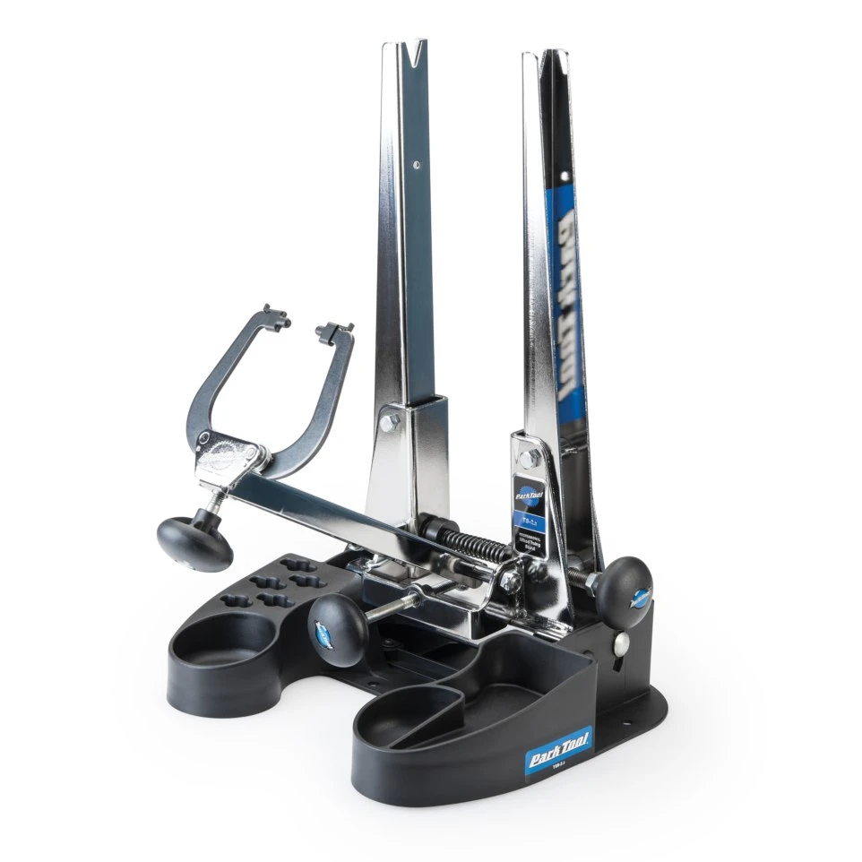 Securely holds any of Park Tools TS-2, TS-2.2, and TS-2.2P Professional Wheel Truing Stands and tilts 20 degrees from front to back for comfortable wheel work and sight lines at any bench height. Features a wide, sturdy base, small parts compartments, spoke wrench holders, and is constructed of a durable composite material.