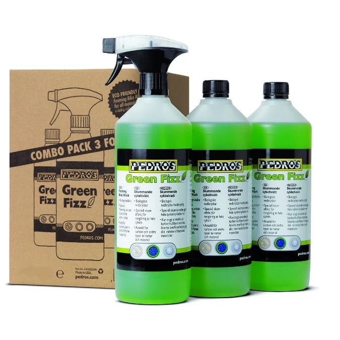 Green Fizz is different than many other bike wash products because it uses proprietary surfactants, instead of solvents, to lift dirt and grime from the whole bike. The surfactants work quickly on dirt and other contaminants by lowering the surface tension of the dirt molecules and allowing it to be effortlessly wiped or rinsed from the bike.