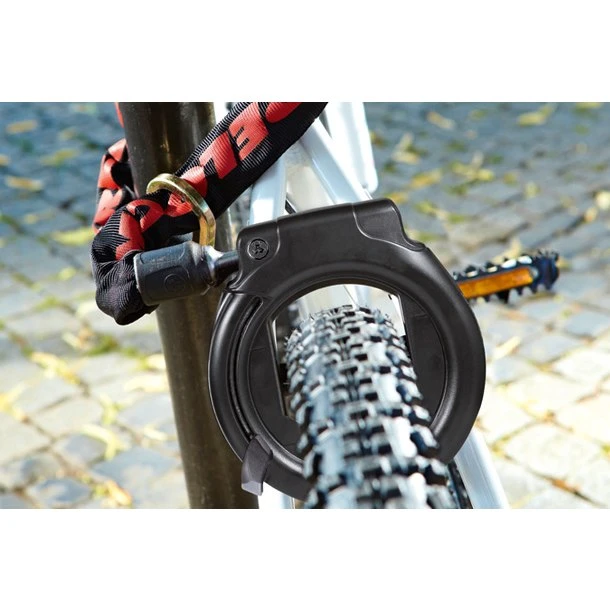 The RS 453 PROTECT-O-CONNECT® has the modern IN-X® in-track cylinder. The new bike-frame lock can be ideally enhanced with Trelock’s stylish supplementary chains. The chains either have striking colors or stylish designs and they are usable as extra protection for the bicycle. The chain can be used to fix the bike to a stationary object like a street lamp for example: simply plug the chain into the lock and then close the bike-frame lock.