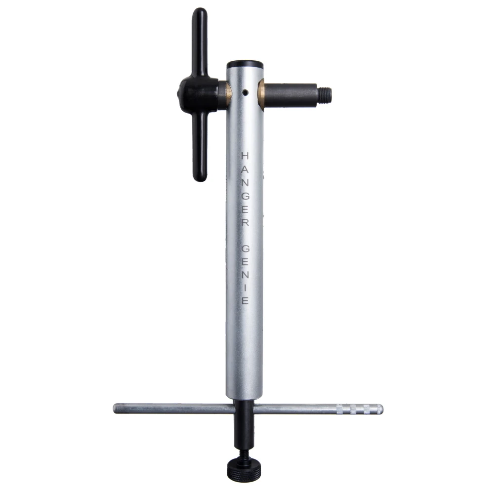Hanger Genie is foldable and precise tool, used for re-aligning rear derailleur hangers and maintaining precise gear shifting. It´s compatible with all wheel sizes from 20˝ to 29˝+ and screws directly into rear derailleur hanger threads. Precise measuring gauge can be locked in place, so you don´t lose you measurement when you push it against the wheel in different positions. Thanks to rotating bottom part of the tool, you can easily clear the frame when you work your way around the wheel.
